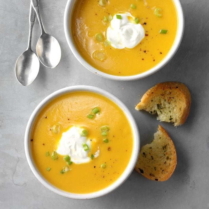 This delectable soup feels like fall! Its golden color and rich, satisfying flavor have made it a favorite of mine—which is really amazing because I was convinced I didn't like squash until I tried this recipe. —Becky Ruff, Monona, Iowa