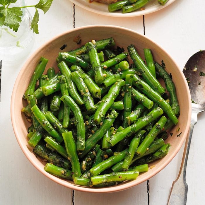 This is how my mom always made green beans. She got the recipe from a neighbor when we lived in Turkey. Make a double batch as they make an excellent healthy snack straight from the fridge. Add a thinly sliced onion and red bell pepper if you like. —Trisha Kruse, Eagle, Idaho
