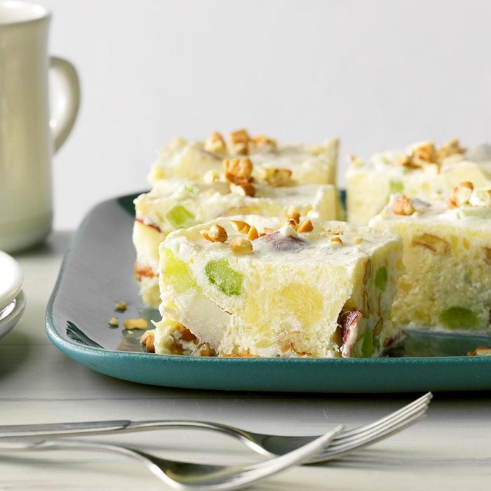 Looking for a festive dish to light up the buffet? This pretty green gelatin dessert salad is eye-catching and has a delightful, tangy flavor. —Cyndi Fynaardt, Oskaloosa, Iowa