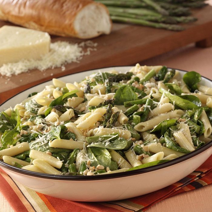 Fresh spinach, crunchy cashews and penne pasta are tossed with roasted asparagus to create this delightful spring salad. —Kathleen Lucas, Trumbull, Connecticut