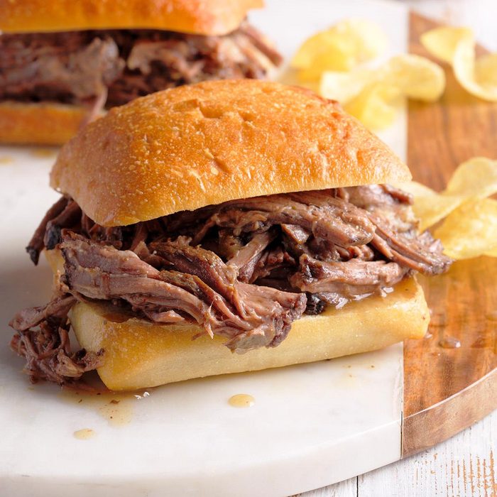 These hot sandwiches make a standout addition to any buffet line. Make sure to have plenty of small cups of broth for everyone to grab. It's dipping perfection! —Holly Neuharth, Mesa, Arizona
