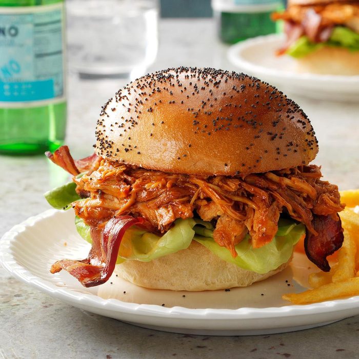 I simmer chicken thighs in a spicy-sweet sauce, shred them and then pile 'em high on pretzel buns to create an incredibly addictive party food. —James Schend, Pleasant Prairie, Wisconsin