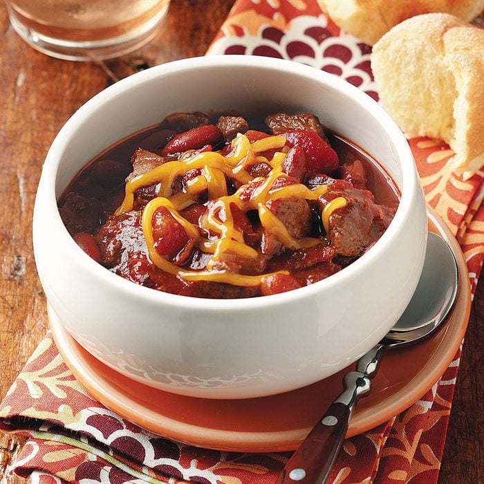 We often have chili cook-offs at our church, so we trade lots of different recipes. I was always mixing and matching ingredients and experimenting, trying to come up with an original recipe that would be a little different. That's how I developed this one, and I never fail to get compliments on it! —Sally Grisham, Murray, Kentucky