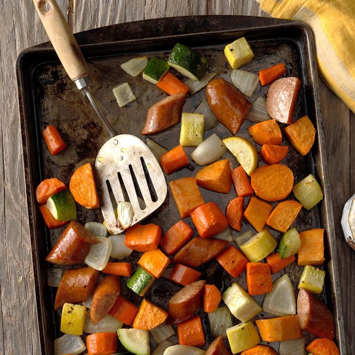 I like this dish featuring kielbasa and veggies for two reasons: It’s so hearty, and it’s a one-pan meal. That’s a win-win dinner! —Marietta Slater, Justin, Texas