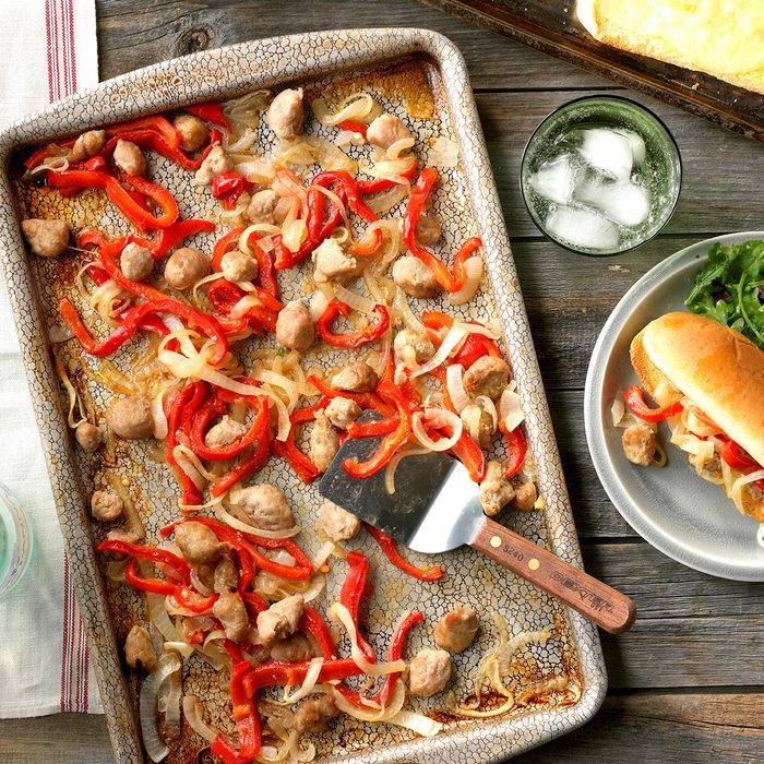 Sausage with peppers was always on the table when I was growing up. Here’s how to do it the easy way: Just grab a sheet pan and the ingredients, then let the oven do the work. —Debbie Glasscock, Conway, Arkansas