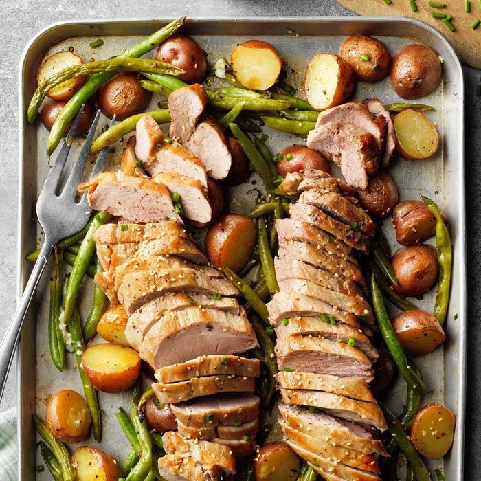 I created this pork tenderloin sheet-pan dinner to suit our family’s needs. It’s so quick and easy to clean up since you use one pan for everything! Use any variety of small potatoes—fingerlings or other colored potatoes are a fun and delicious option. —Debbie Johnson, Centertown, Missouri