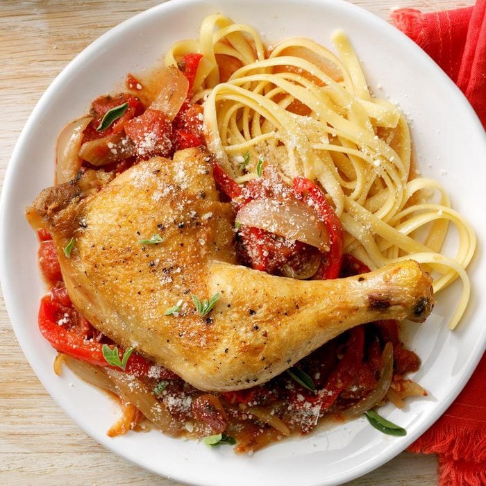 Chicken cooked “cacciatore” means a dish prepared “hunter-style” with tomatoes, mushrooms, onions and seasonings. We add a touch of white wine to make ours northern Italian-style. —Lisa Bynum, Brandon, Missouri