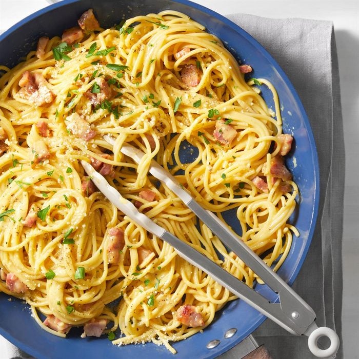 Spaghetti carbonara is a classic Italian recipe. The key is to use the hot pasta water to make the dish creamy. If made properly, there is no need to add cream or milk. The dish is luxurious, satisfying, comforting, and easy to make. If you like, you can add peas after you have cooked the pancetta and garlic. Use any pasta you like, but the consistency is usually best with a thicker spaghetti. —Luisa Webb, Fort Collins, Colorado