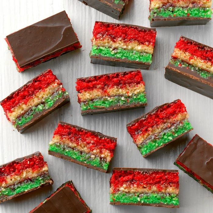 The name “rainbow cookies” is actually a bit of a misnomer for these classic New York treats. To make the pretty layered cookies, you’ll bake three thin cakes, spread jam between them and coat with smooth melted chocolate. —Shannon Sarna, South Orange, New Jersey