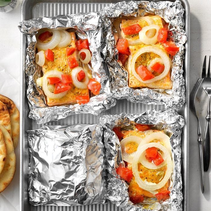 Steamed in its own juices, this grilled salmon in foil is incredibly tender. Curry adds a punch of flavor that’s perfectly balanced by onion and tomato. —Merideth Berkovich, The Dalles, Oregon