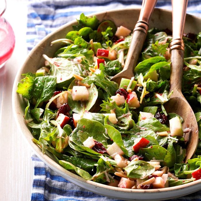 Dried cranberries, crunchy apple chunks and toasted almonds dress up this crisp green salad. It's drizzled with a sweet-tart dressing that's a snap to blend. —Taste of Home Test Kitchen