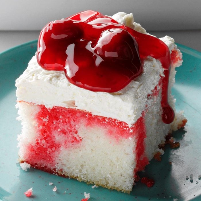 I serve this cherry cake for holidays because it’s so festive and easy. No one will know your secret is adding a package of cherry gelatin to a boxed cake mix! —Margaret McNeil, Germantown, Tennessee. Looking for more easy recipes? Try these potluck desserts that can be made with packaged cookies.