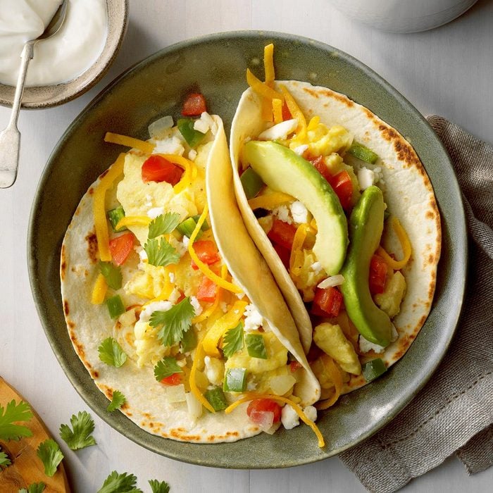 Unless you grew up in the Southwest or visit there often, you might be hearing of migas for the first time. Think of them as the best scrambled eggs ever. The secret ingredient: corn tortillas. They’re what really make my migas tacos special! —Stephen Exel, Des Moines, Iowa