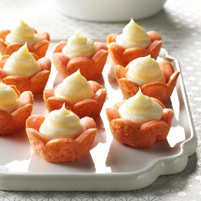 My mom and I made up this recipe by combining two others. These cute cookies are crispy on the outside and light and fluffy inside. You could also bake the cookies flat and serve the filling as a cookie dip if you like. —Crystal Briddick, Colfax, Illinois