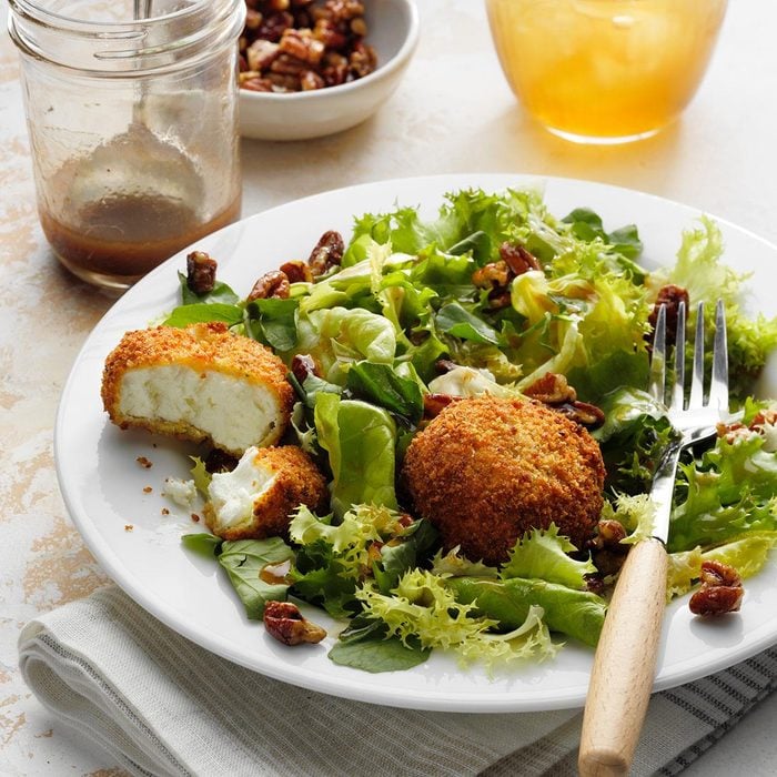 Fried goat cheese is the tastiest salad topping you never knew you needed. Crispy on the outside and creamy on the inside, these breadcrumb-covered cheese balls turn salad into elevated comfort food.