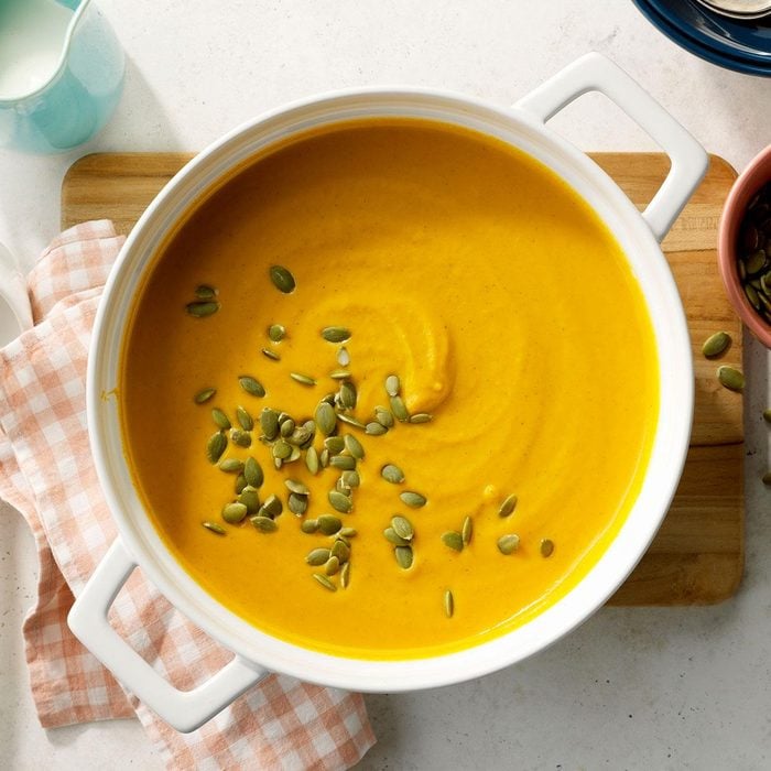 Winter squash varieties always make hearty soups. Blending winter squash with sweet potato and summer squash creates the soup’s smooth, creamy texture.