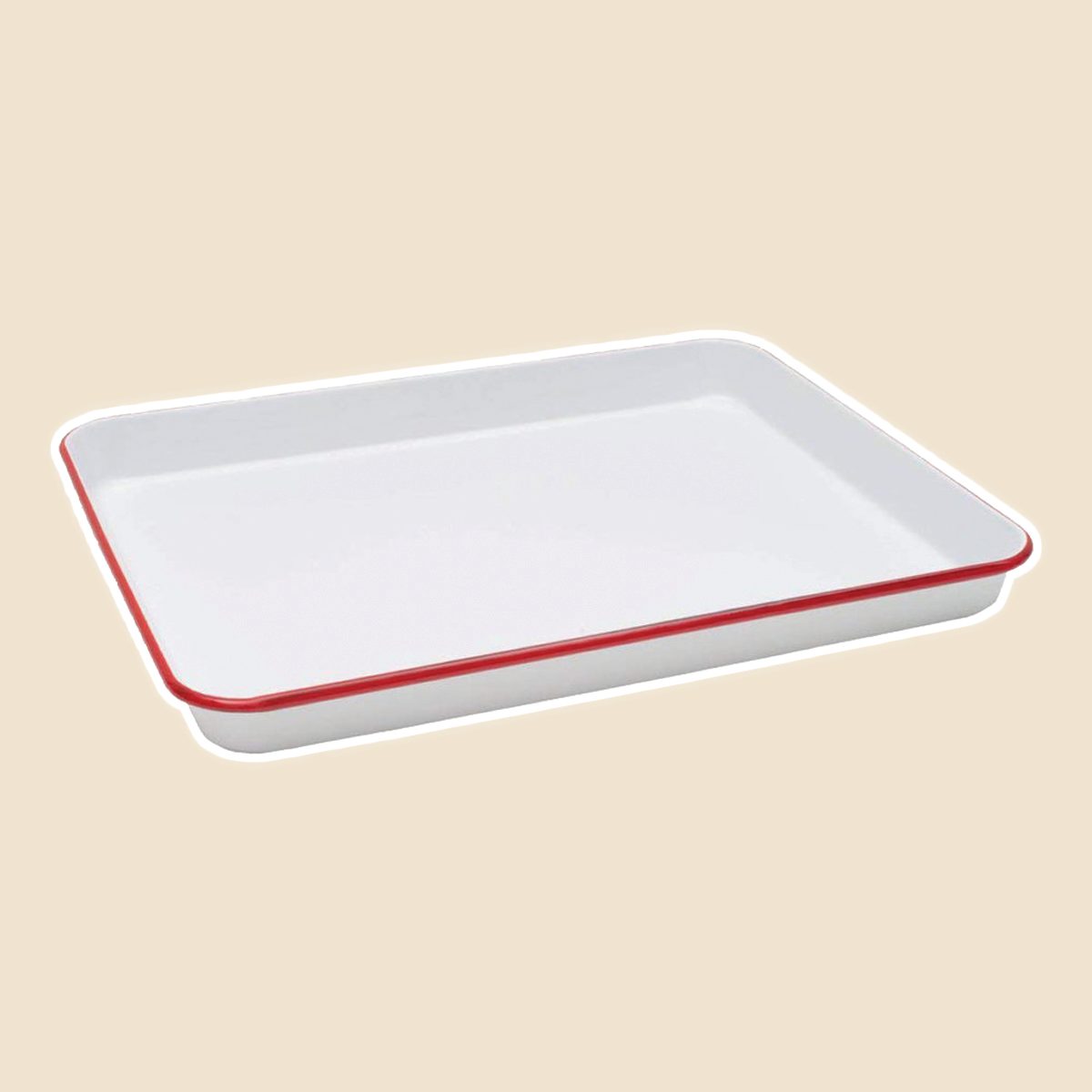 In solid white with red trim, this enamel baking pan adds a bit of retro flair to whatever strikes your baking fancy. Roomy enough for cookies (oh lemon meltaways, how we love thee!) or a loaf of bread, this dish can be a versatile, hardworking addition to your kitchen collection.