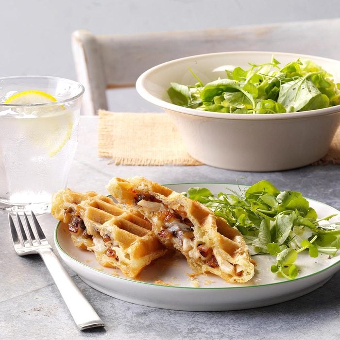I took one of our family’s favorite puff pastry recipes, which uses a similar mix of ingredients, and translated it to savory waffles. It’s a change of pace from sweeter fare. Served with a ham steak and fried eggs, it makes a fabulous meal. Feel free to add maple syrup or a spicy glaze. —Leslie Ponce, Miami, Florida