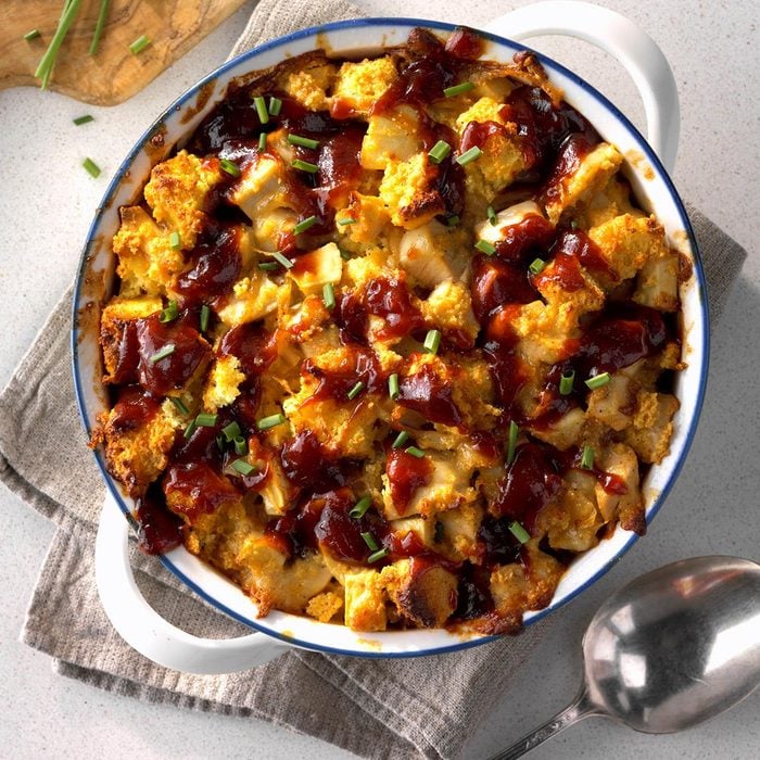 This sweet and savory bread pudding—featuring boxed cornbread mix, chopped barbecue chicken, tart green apples and gooey Monterey Jack cheese—is a unique way to enjoy a fall dinner. All it’s missing is a vegetable side.