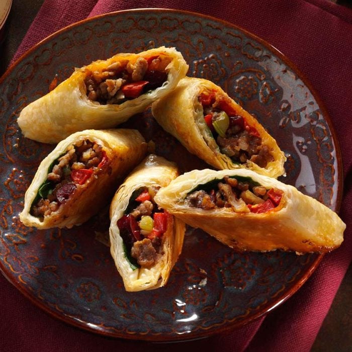 Little bites deliver big flavor in this combination of tangy sausage and creamy cheese in crisp wontons. The recipe is an appetizing takeoff on my favorite Mexican entree. —Kari Wheaton, South Beloit, Illinois