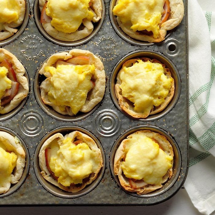 My tostadas feature the ingredients of a classic Denver omelet: ham, cheddar and green pepper. I also make a zesty Mexican version with chorizo and pepper jack and a Reuben with corned beef and Swiss. —Joi Sinclair, Atchison, Kansas