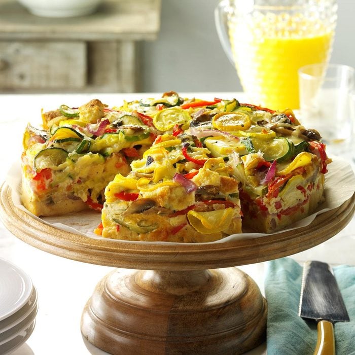 I've been cooking this strata for years, and my family just can't get enough! Fresh basil gives the healthy brunch dish an added flavor boost. —Jean Ecos, Hartland, Wisconsin.