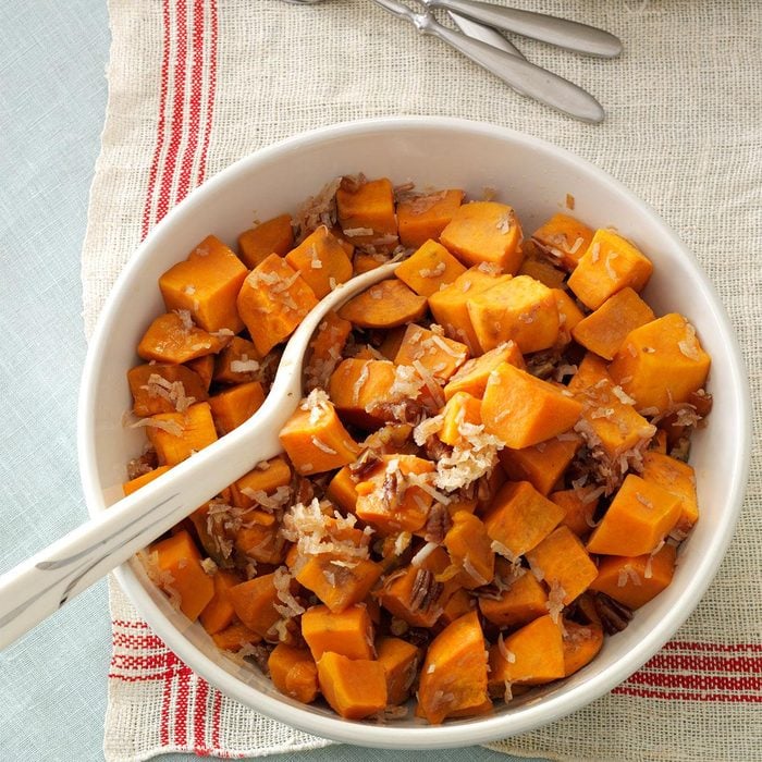 These delicious sweet potatoes cook effortlessly in the slow cooker so you can tend to other things. Coconut gives the classic a fresh twist. —Raquel Haggard, Edmond, Oklahoma
