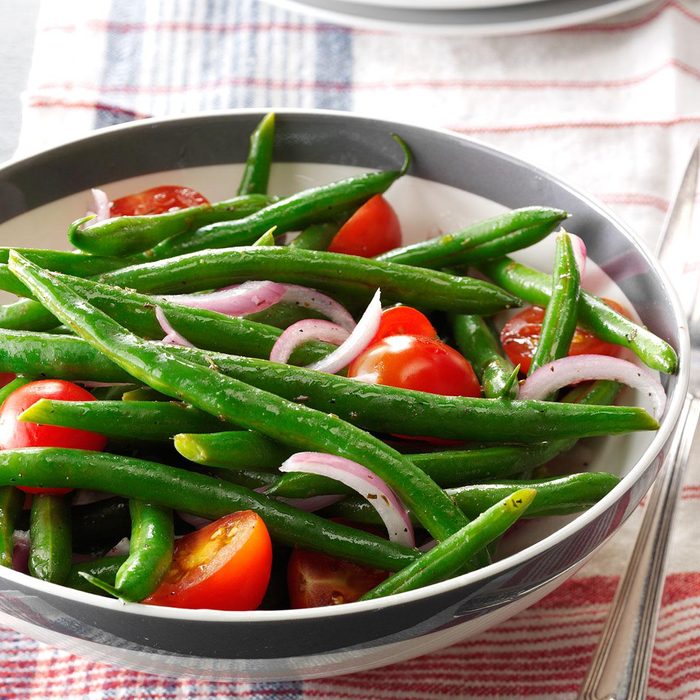 My grandmother made a cold green bean salad with potatoes for every family barbecue. Now I bring my own version of the recipe to parties. With added color and taste from the cherry tomatoes, this classic favorite is even better. —Angela Lemoine, Howell, New Jersey