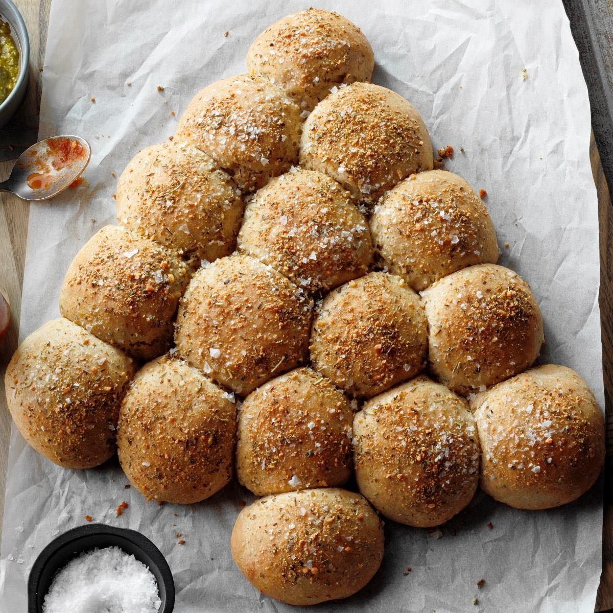 Christmas tree pull-apart bread is arranged in a festive shape for the Yuletide season, but the yeast rolls can also...