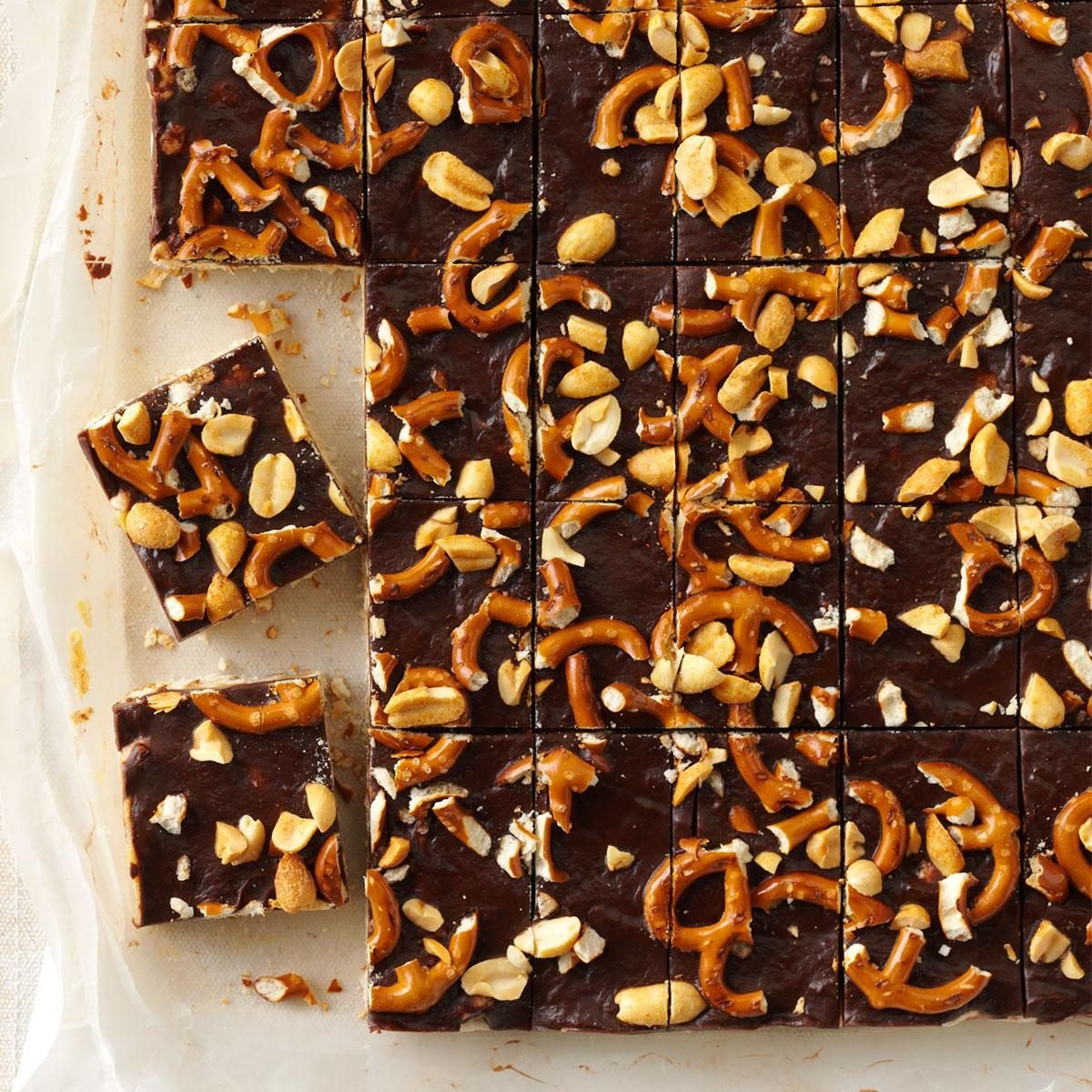 My twist on rice crispy bars includes crunchy crushed pretzels. Then I top them with a creamy peanut butter coating...
