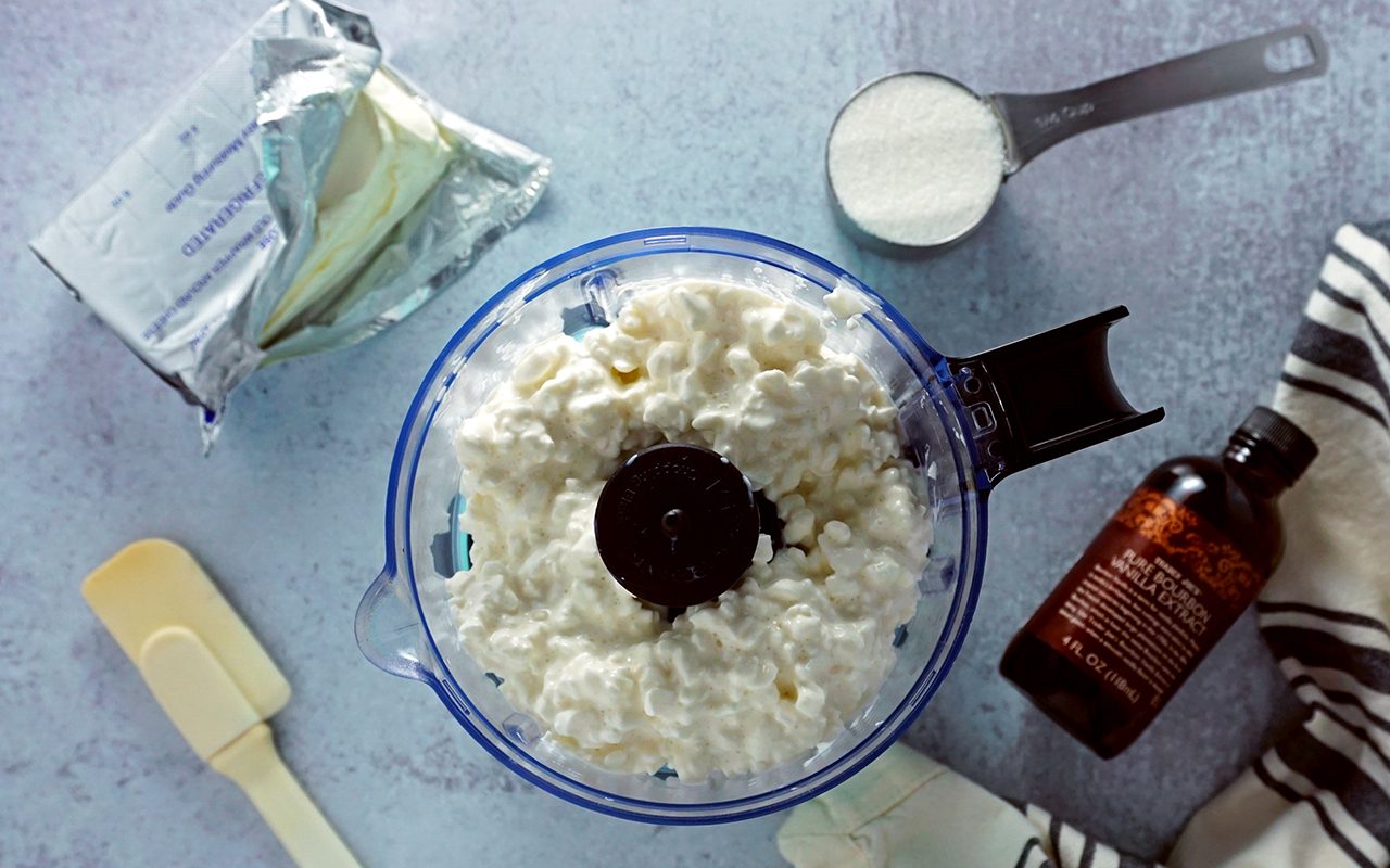 While the batter chills, prepare the cheese filling. In a food processor, blend the cottage cheese until smooth. Add the softened cream cheese, sugar and vanilla and pulse until creamy. Cover and chill until ready to use.