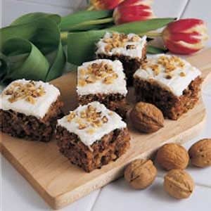 My husband constantly requests this homey, old-fashioned version of carrot cake. The frosting is still tasty even without the pecans....