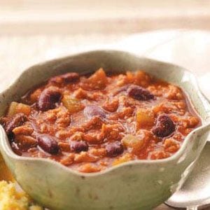 Four kinds of beans and plenty of seasonings make this chunky chili a crowd-pleaser, particularly on autumn days. "Serve bowls...