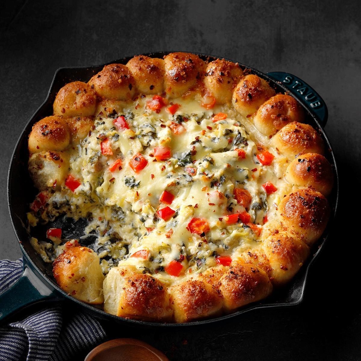 Grated Parm, shredded mozzarella, cream cheese, mayo and butter make this dip as decadent as it gets. —Taste of Home...