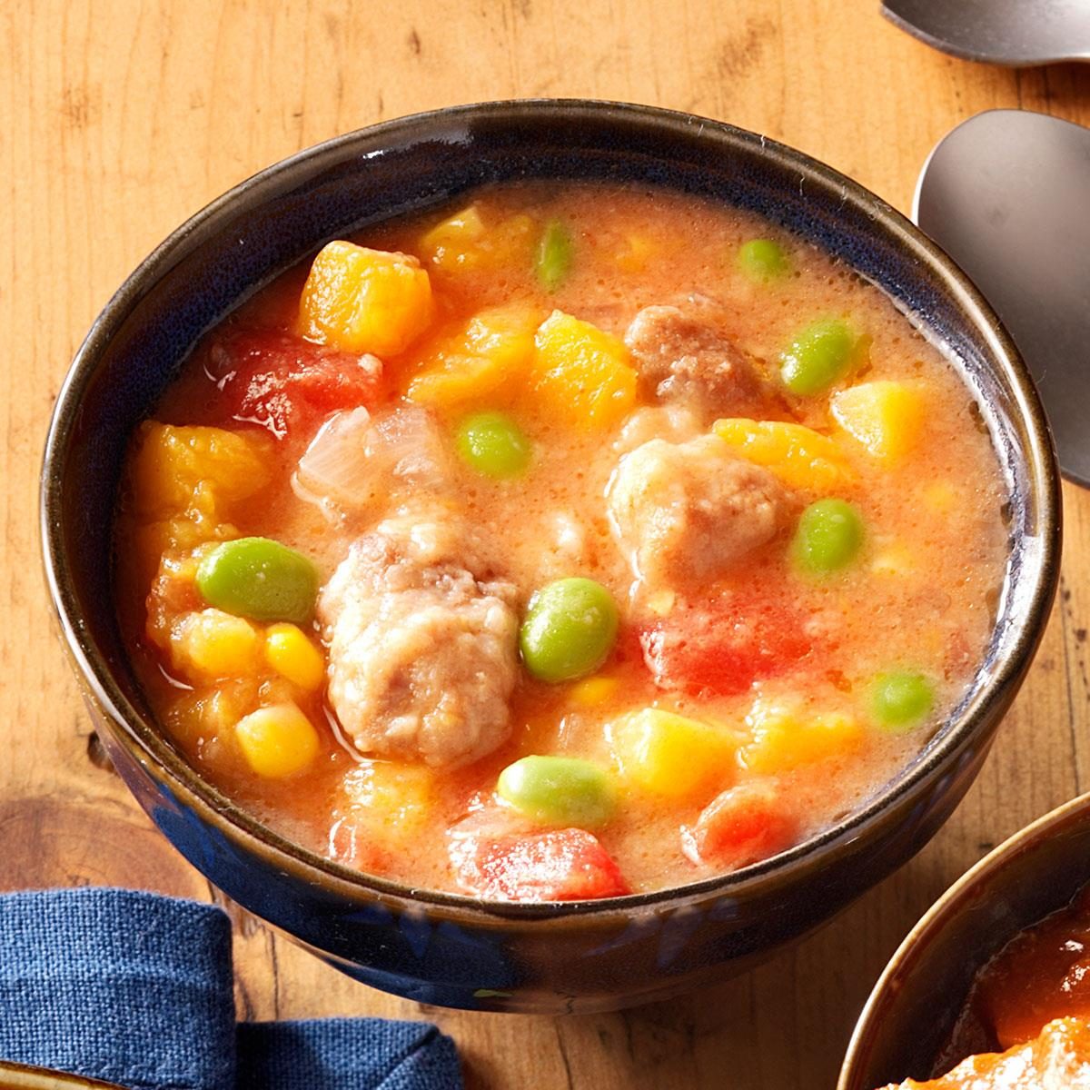 Looking for a meal in a bowl? Sit down to a Mexican classic full of cubed pork, sliced sausage, hominy and more. It all goes into the slow cooker, so you can come home at night to a table-ready dinner. —Greg Fontenot, The Woodlands, Texas