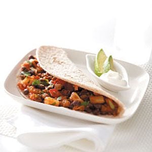 You won't miss the meat in these hearty and flavorful sweet potato tacos. Fluffy flour tortillas layered with refried black...