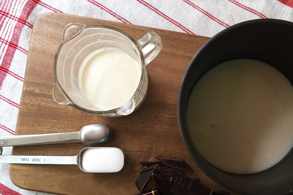To make, start by chopping four ounces of chocolate. We used a very dark chocolate, but you can use milk if you prefer—just be sure to use a chocolate that you’d be happy to eat on its own. Once it’s chopped, add it to a small saucepan with the whipping cream, milk and sugar.