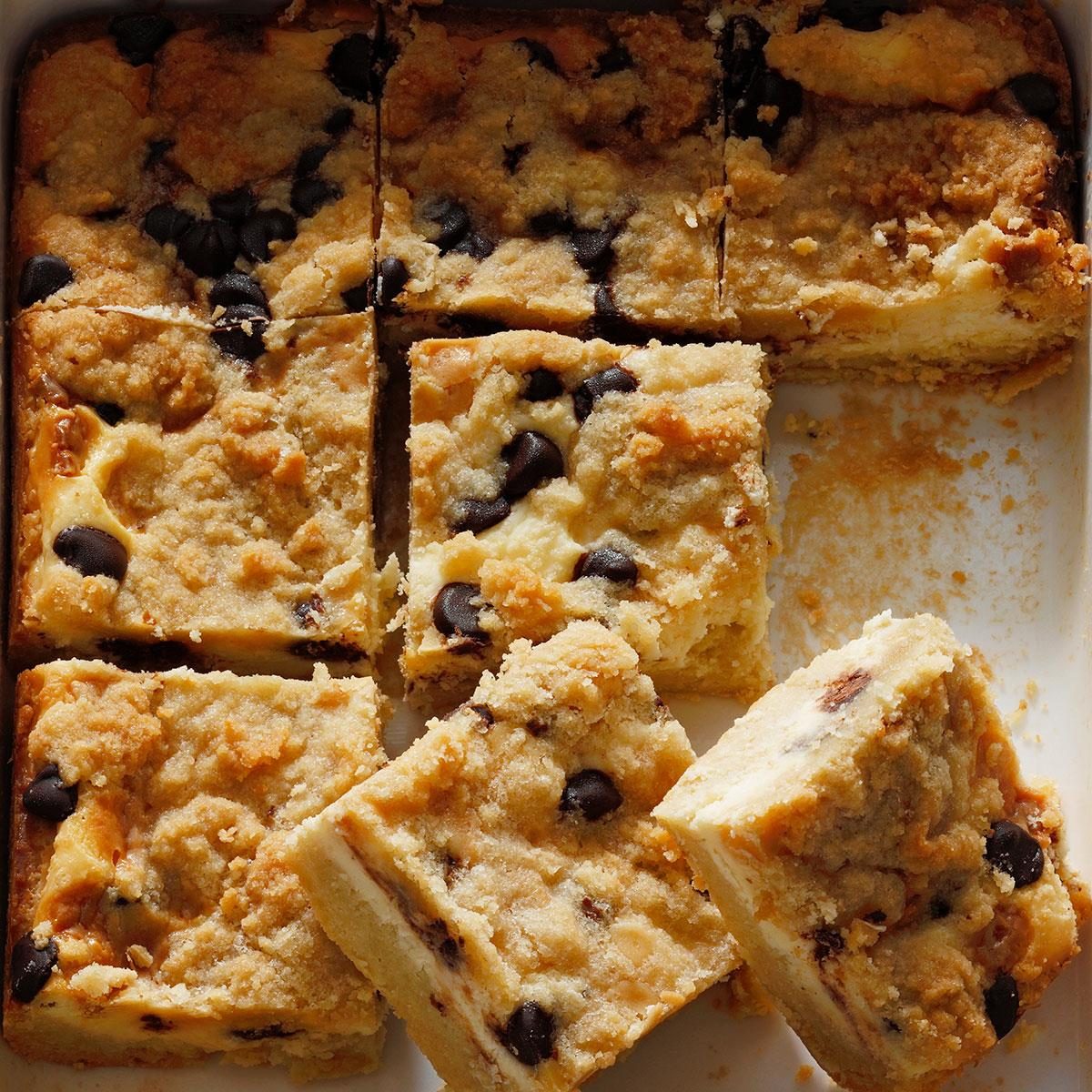 These cheesecake bars have four delectable layers: a buttery crust, a creamy cheesecake filling, chocolaty morsels and a crumbly topping....