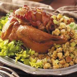 A hunter's holiday dinner from field editor Gloria Warczak of Cedarburg, Wisconsin features bacon-topped pheasants with savory oyster stuffing. No...
