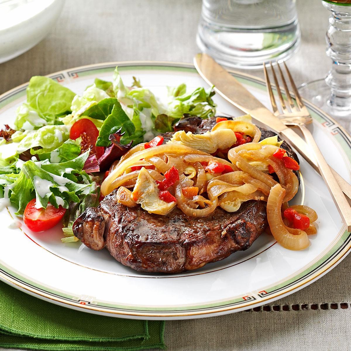 Light green artichokes and vibrant pimientos dress up these delicious steaks. If weather permits, grill the steaks outside and prepare...