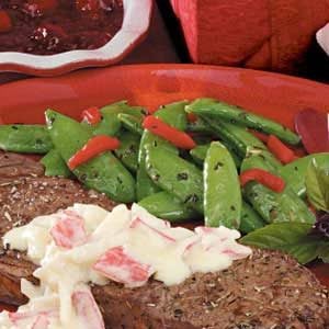 Complement the sauce-topped steaks with this vibrant side dish that cooks in the microwave in mere minutes. Fresh sugar snap...