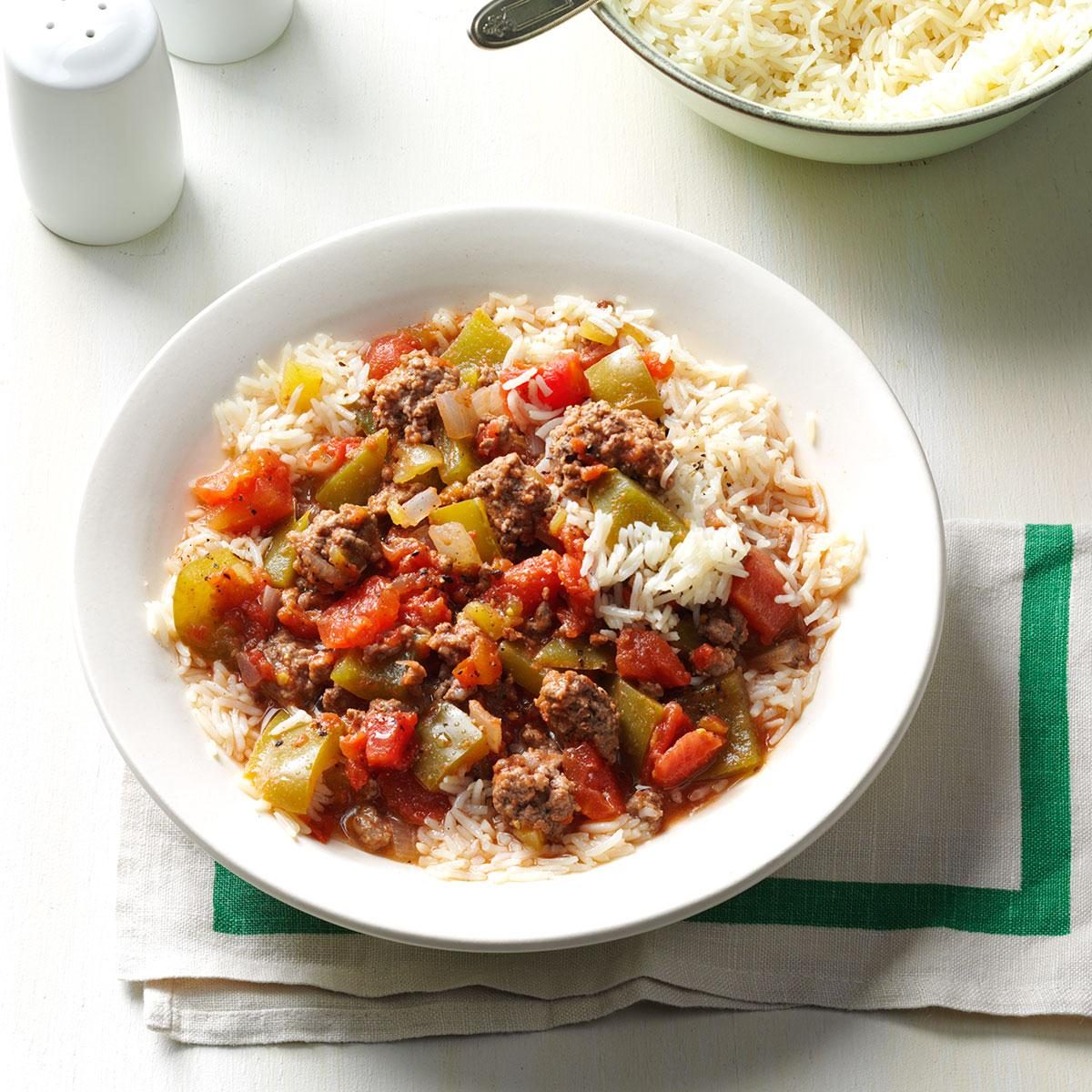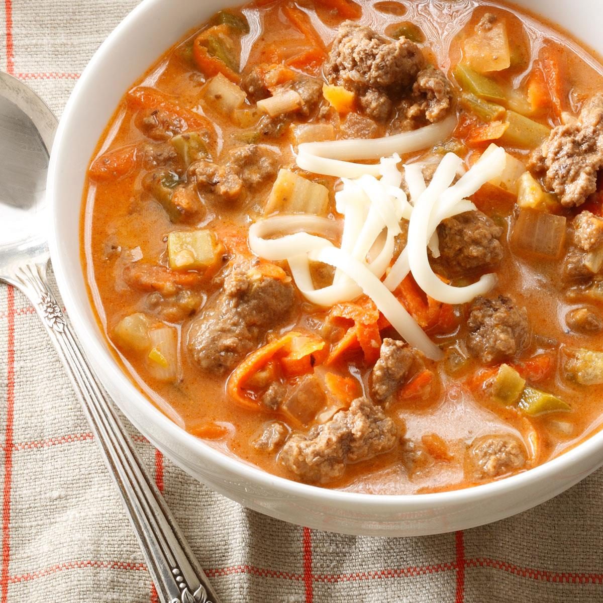 This is an excellent example of how convenience foods can be combined for a tasty entree. Ready in minutes when I get home from work, this soup becomes part of a balanced meal with a tossed salad, rolls or fruit. For a variation, try chicken, turkey or even venison instead of ground beef. –Tracy Thompson, Cranesville, Pennsylvania