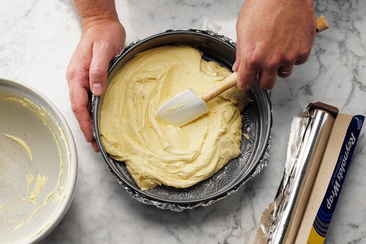 Grab your 9-inch springform pan and wrap the exterior with a sheet of foil. (Even leakproof pans aren’t foolproof!) Then spritz the interior of the pan with cooking spray. Even if the pan is nonstick, grease it to make removing the cake easier.